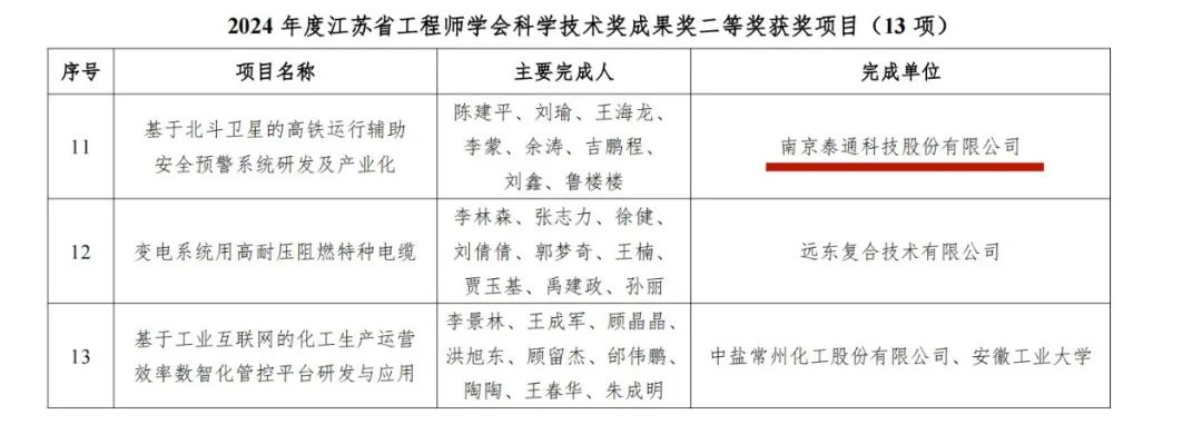 由泰通科技獨(dú)立完成的“基于北斗衛(wèi)星的高鐵運(yùn)行輔助安全預(yù)警系統(tǒng)研發(fā)及產(chǎn)業(yè)化”項(xiàng)目,經(jīng)過層層評(píng)審,從諸多申報(bào)項(xiàng)目中脫穎而出,榮獲“2024年度江蘇省工程師學(xué)會(huì)科學(xué)技術(shù)獎(jiǎng)成果獎(jiǎng)二等獎(jiǎng)”。